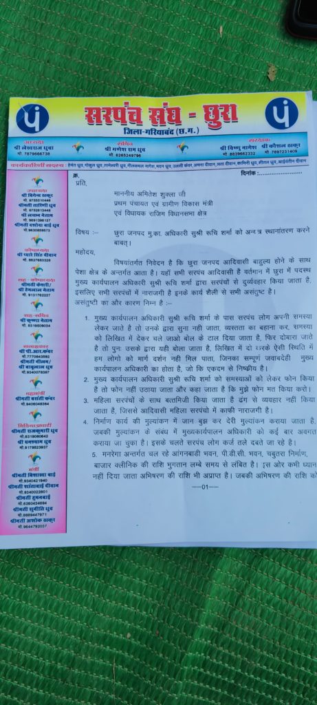 छुरा सरपंच संघ ने जनपद मुख्य कार्यपालन अधिकारी के ऊपर नाराजगी जताते हुए की वर्तमान में छुरा में पदस्थ मुख्य कार्यपालन अधिकारी द्वारा हम सरपंचों की बात नहीं सुनी जाती। हमे मार्ग दर्शन नहीं दिया जाता है। जिससे हम सभी सरपंचों में नाराजगी है। इनके कार्य शैली से सभी असंतुष्ट है ।