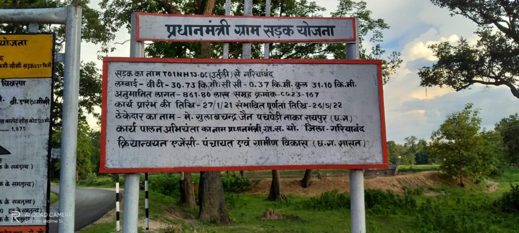 प्रधानमंत्री ग्राम सड़क योजना सड़क का नाम TOINH130 C उरतूली से गरियाबंद तक लम्बाई – वीटी 30.73 कि.मी.सीसी 0.37 कि.मी. कुल 31.10 कि.मी. अनुमानित लागत – 861.80 लाख समह क्रमांक – CG 23-167 ठेकेदार मे. गुलाबचन्द्र जैन के द्वारा सड़क 31 कि.मी लंबाई तक उरतूली से गरियाबंद मार्ग में सड़क बनाई गई कार्य गुणवक्ता हिन से की गई । एक बहुत ही बड़ी बात है कि ठेकेदार केवल जोबा पंचायत से हो शासकीय भूमि का noc लिया गया है। जोबा पंचायत शासकीय भूमि पर लीज लिया गया था । खसरा 365 में पंचायत को धोखा देकर noc लिया गया