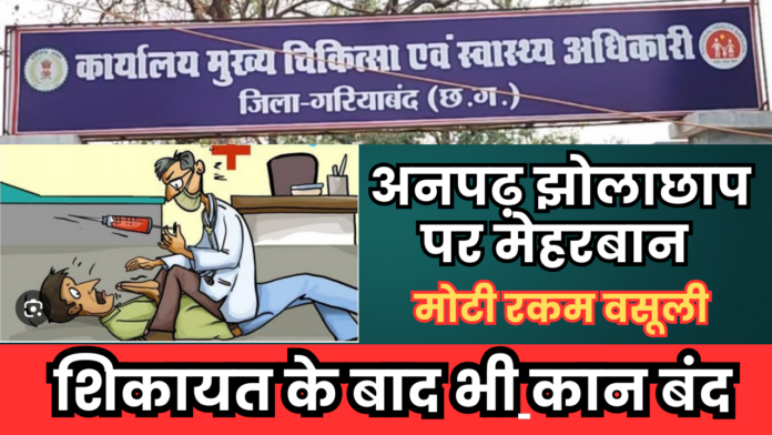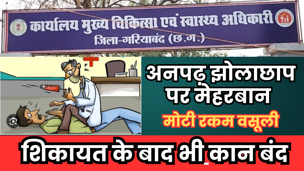 जिला गरियाबंद ब्लॉक छुरा में झोलाछाप डॉक्टर, वे बिना किसी वैध चिकित्सा डिग्री या लाइसेंस के चिकित्सा कर रहे हैं l वे अक्सर मरीजों के साथ धोखा करते हैं। और उन्हें नुकसान पहुंचाते रहे हैं. cmho ऑफिस में शिकायत की गई है कि झोलाछाप डॉक्टरों पर उचित दंडात्मक कार्यवाही के लिए आवेदन दिया गया है। ग्राम पंचायत चुरकीदादर, नयापारा कोसमी कोठीगांव में झोलाछाप कथा कथित डॉक्टर गरीब आम जनता को गलत इलाज कर रहे हैं जिसमें कुछ महीनो में कुछ बच्चे की मृत्यु एवं बुजुर्ग को heart attack आने से उनकी मौत हो गई है। गलत इलाज के दौरान मौत होने की सूचना कई बार खंड चिकित्सा अधिकारी कीर्तन साहू को दिया गया । आवेदन आने पर उन्होंने उन झोलाछाप डॉक्टर को अपने ऑफिस में बुलाकर मीटिंग कर भेज दिया जाता है एवं किसी प्रकार से कार्रवाई नही किया जाता है क्या साठ गाट है की झोलाछाप डॉक्टरों पर मेहरबानी बनी हुई है l शिकायत के बाद भी कोई कार्यवाही होती ?