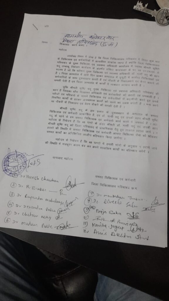 जिला चिकित्सा गरियाबंद में कुछ माह से लगातार विवाद की स्थिति बनी हुई है चिकित्सा एवं कर्मचारियों में अत्यधिक आक्रोश व्यक्त किया गया है। क्योंकि जिला चिकित्सालय गरियाबंद के मुख्य चिकित्सा एवं स्वास्थ्य अधिकारी कार्यालय के सदस्य श्रीमती सृष्टि यदु तंबाकू नियंत्रण कार्यक्रम के अंतर्गत संविदा काउंसलिंग के पद पर एनएचएम में पदस्थ है। जो कि वर्तमान मुख्य चिकित्सा एवं स्वास्थ्य अधिकारी डॉक्टर गार्गी यदु पाल की बहन लगते हैं । जिला चिकित्सालय में जाकर आए दिन ड्यूटी में कार्यरत चिकित्सकों को एवं कर्मचारियों के साथ दुर्व्यवहार करती हैं एवं नौकरी से निकलवाने एवं वेतन काटने की धमकी देती है। जिला अस्पताल में कार्य में व्यवधान उत्पन्न करती रहती हैं । श्रीमती सृष्टि यादव मुख्य चिकित्सा एवं स्वास्थ्य अधिकारी गरियाबंद की बहन है। जिसका बहन की धौंस दिखाकर अधिकारी एवं कर्मचारियों को डराती एवं धमकाती हैं मरीजों एवं परिजनों के सामने चिकित्सा एवं कर्मचारियों से बदतमीजी करते रहती है। उनके नियमित कार्यों से हटकर नियम विरुद्ध कार्य को करवाने का दबाव बनाती है । मना करने पर नौकरी से निकाल देना एवं वेतन रोकने की धमकी देती हैं श्रीमती सृष्टि यादव के इस प्रकार के दुर्व्यवहार से अस्पताल चिकित्सा एवं कर्मचारी आक्रोश है गार्गी यदु पाल एवं उनकी बहन श्रीमती सृष्टि यदु के रहने से हम समस्त चिकित्सा एवं कर्मचारी कार्य करने में असमर्थ है । गार्गी याधु पाल एवं उनकी बहन सृष्टि यदु पाल को 48 घंटे के अंदर नहीं हटने से पूरे डॉक्टर एवं स्टॉफ कलम बंद कर बहिष्कार किया जाएगा कड़ी चेतावनी दिया गया है जिला अस्पताल के सम्पूर्ण स्टॉफ के द्वारा जिला अस्पताल के सम्पूर्ण स्टॉफ असंतुष्ट 62 व्यक्तियों ने की शिकायत