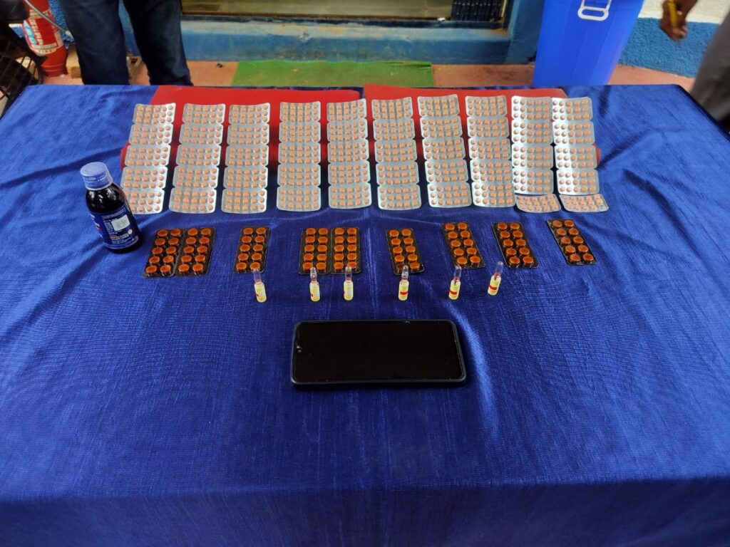 एमआरपी-36.20, कुल किमती 1800रु 02. नाइट्रेज़पम टैबलेट आईपी 10एमजी नाइट्रोसन 10 बी.नो 5395 एमएफजी, एक टेबलेट वजन 0.57 एमजी कुल 09 स्ट्रीप का वजन 64.51 एमजी कीमती 585 रु. 3. इम्पूल पेंटाजोसिन 06 नग लैक्टेज इंजेक्शन आईपी अलकन लैबोरेटरिक्स 1एमएल 30एमजी B.NO 5912 एमएफजी 02/22 ऍक्स्प 01/2025 वजन 15.6एमजी, एमआरपी 24.24 कुल किमती 145.44 पैसे 4. कोफ्यूरेक्स 100एमएल एमएफजी 04/2025 ऍक्स्प 03/2027 वजन 1.800एमजी एमआरपी 172रु, टेबलेट कुल जुमला वजन 185.65एमजी तथा आरोपी के द्वारा उपयोग में लाये हुये पुरानी इस्तेमाली रेडमी कंपनी का मोबाईल काला रंग का कीमती 8,000 रुपया व पुरानी मोटर सायकल किमती 30000 जूमला कीमती 44,702 रु. को गवाह के समक्ष विधिवत जप्त किया गया है। आरोपी कृत्य अपराध धारा 22(ख) एनडीपीएस एक्ट का पाये जाने से अपराध पंजीबद्ध कर विवेचना में दिया गया। विवेचना के दौरान आरोपी को विधिवत समक्ष गवाहन के गिरफ्तार कर न्यायिक हिरासत में भेजी जा रही है।