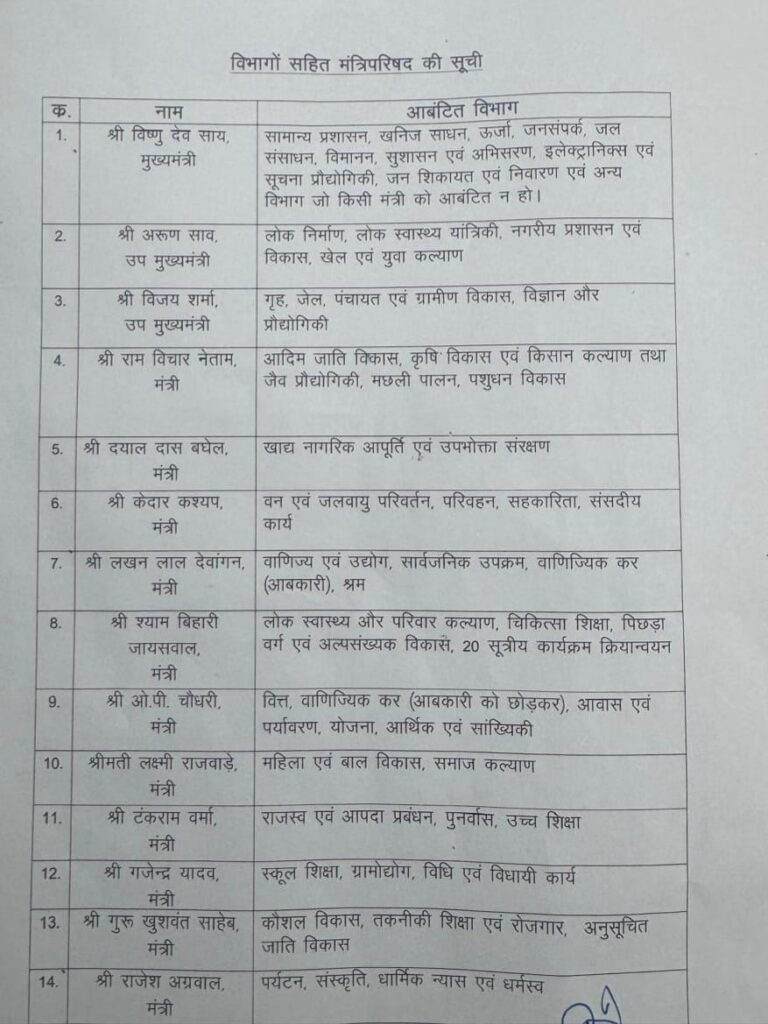 मुख्यमंत्री श्री साय ने सभी मंत्रियों के उज्ज्वल कार्यकाल की मंगलकामना करते हुए कहा कि राज्य सरकार सामूहिक सहयोग और प्रतिबद्धता के बल पर जनता की आकांक्षाओं की पूर्ति के लिए निरंतर प्रयासरत रहेगी।