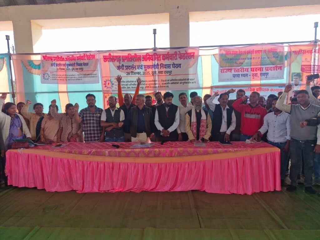 छत्तीसगढ़ प्रदेश के शासकीय कार्यालयों में कार्यरत अनियमित कर्मचारियों के नियमितीकरण/स्थायीकरण, निकाले गए कर्मचारियों की बहाली, न्यून मानदेय कर्मचारियों को न्यूनतम वेतन दिए जाने, अंशकालीन कर्मचारियों को पूर्णकालीन करने, आउट सोर्सिंग/ठेका/सेवा प्रदाता/समूह-समिति के माध्यम से नियोजन सिस्टम बंद करने 28 दिसंबर 2025 को तूता, नवा रायपुर में एक दिवसीय जंगी प्रदर्शन का आयोजन किया गया।