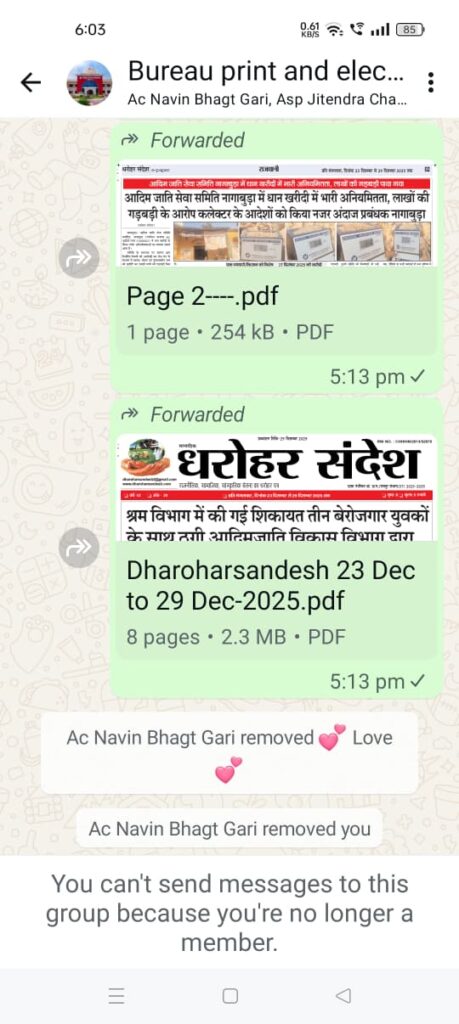आदिम जाति विकास विभाग गरियाबंद में सूचना और अभिव्यक्ति की स्वतंत्रता पर सीधा प्रहार सामने आया है। विभाग से जुड़ी अनियमितताओं और जनहित से जुड़े समाचार साझा किए जाने के बाद सहायक आयुक्त द्वारा समाचार/सूचना पत्रकार ग्रुप से को बाहर कर दिया गया।