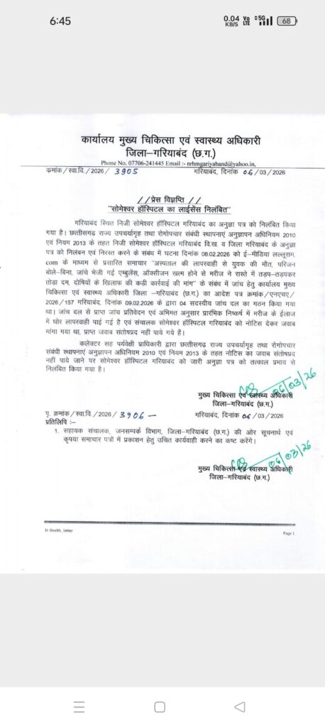 गरियाबंद। जिले के निजी सोमेश्वर हॉस्पिटल पर बड़ी प्रशासनिक कार्रवाई करते हुए उसका लाइसेंस तत्काल प्रभाव से निलंबित कर दिया गया है। यह कार्रवाई मरीज के इलाज में गंभीर लापरवाही के मामले में की गई जांच के बाद की गई है।